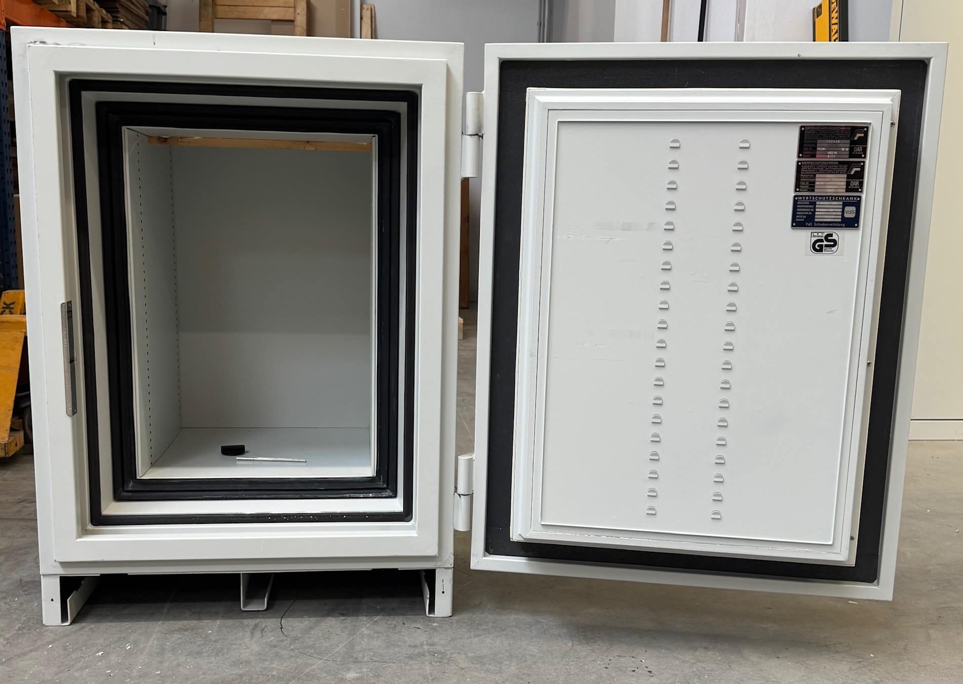 - Durch Füllung mit einer Kombination aus neuartigen Isolierstoffen und dem vierseitig umlaufenden Labyrinth-Feuerfalz mit Dichtungen ist ein extrem hoher Feuer- und Löschwasserschutz speziell für digital abgespeicherte Daten gegeben. Die darin aufbewahrten elektromagnetischen Datenträger, Dokumente etc. sind optimal vor Bränden und Löschwasser geschützt. Die Schränke wurden an der TU Braunschweig erfolgreich einer Feuerwiderstands- und Sturzprüfung, Dauer 2 Stunden, bis 1090°C, unterzogen.